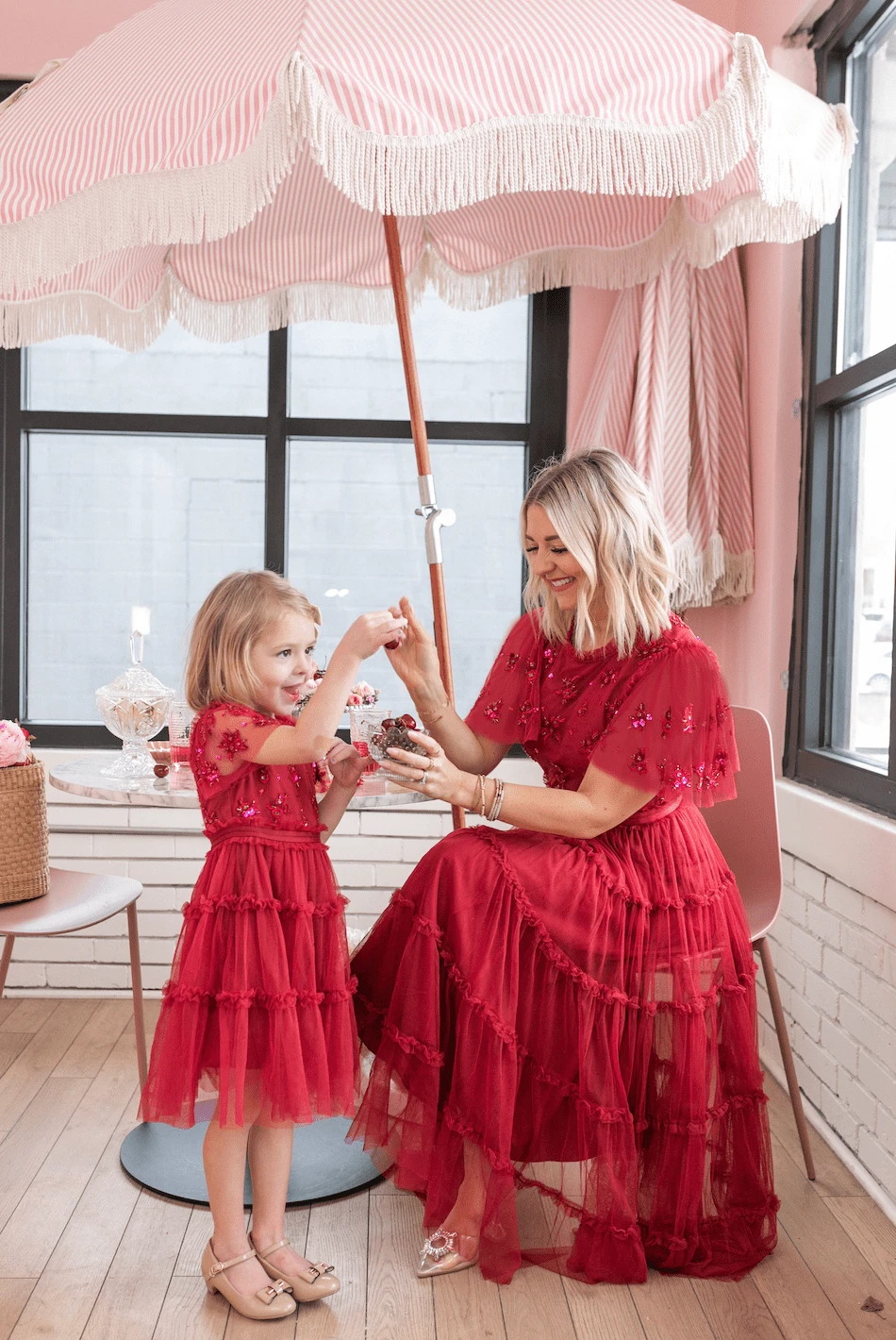 red beaded tulle flutter sleeve midi dress