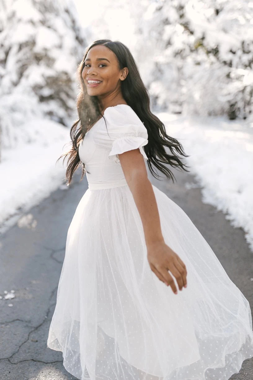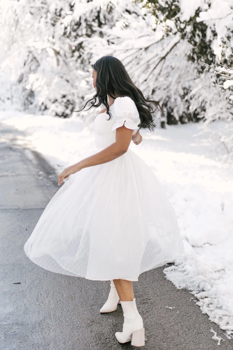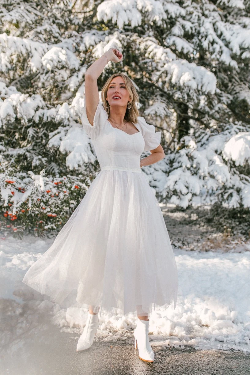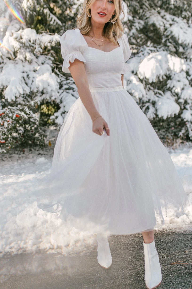 white tulle puff sleeve midi dress