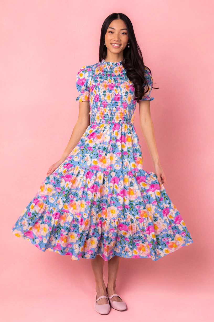 blue floral smocked midi dress
